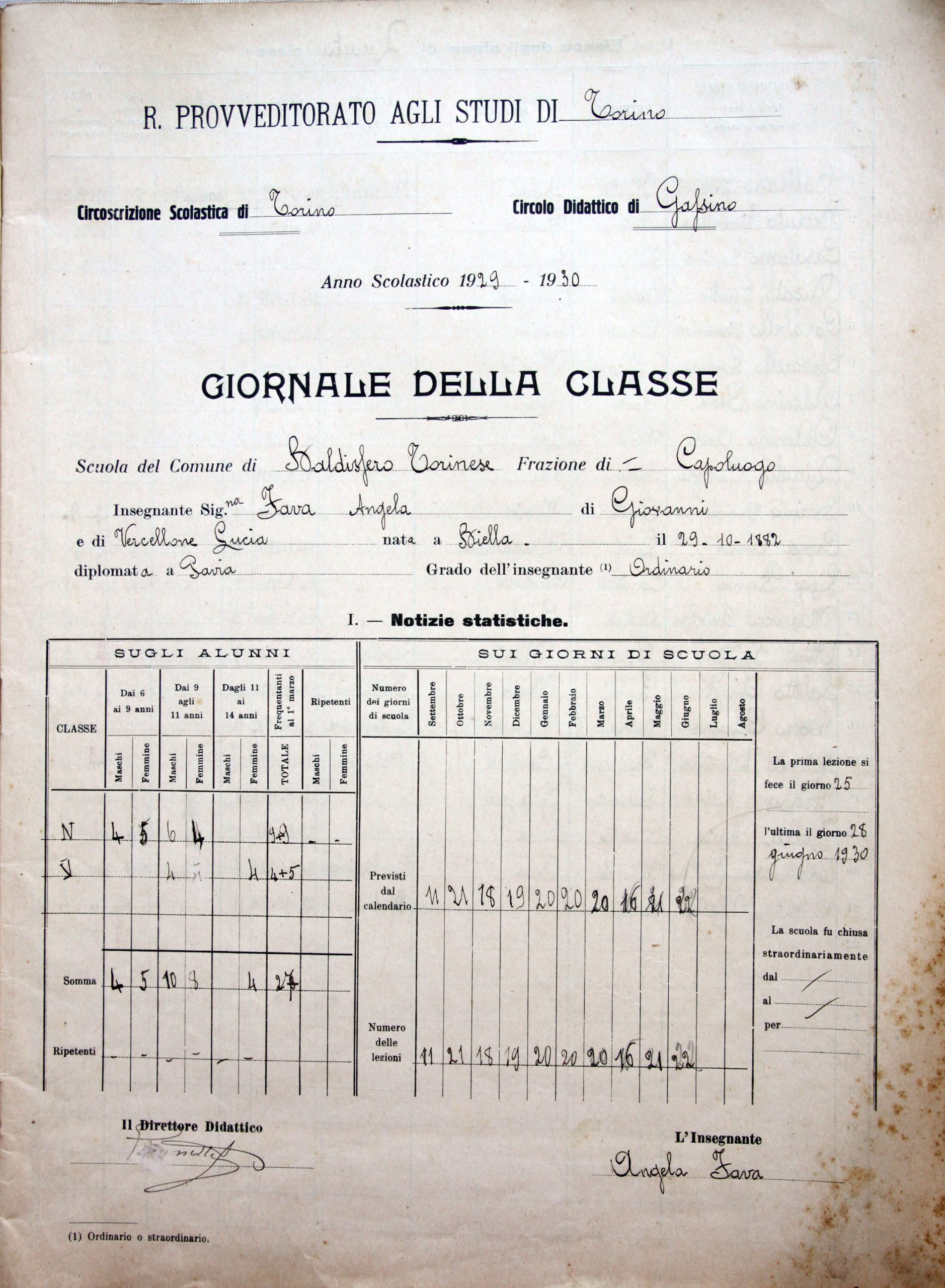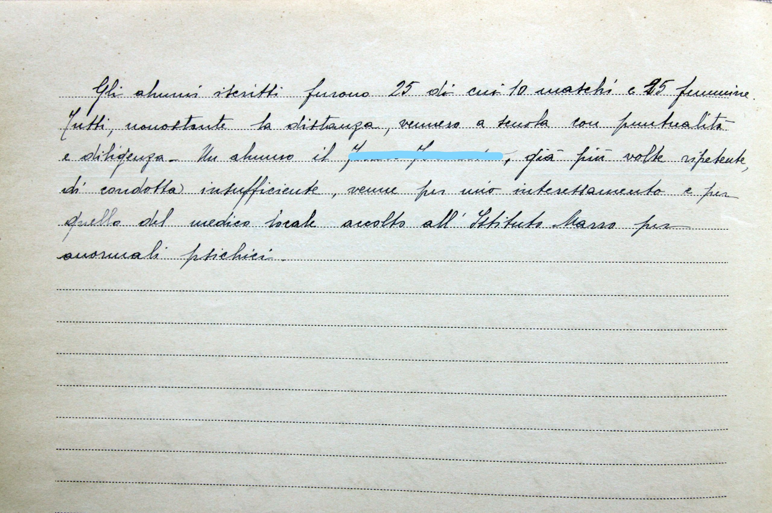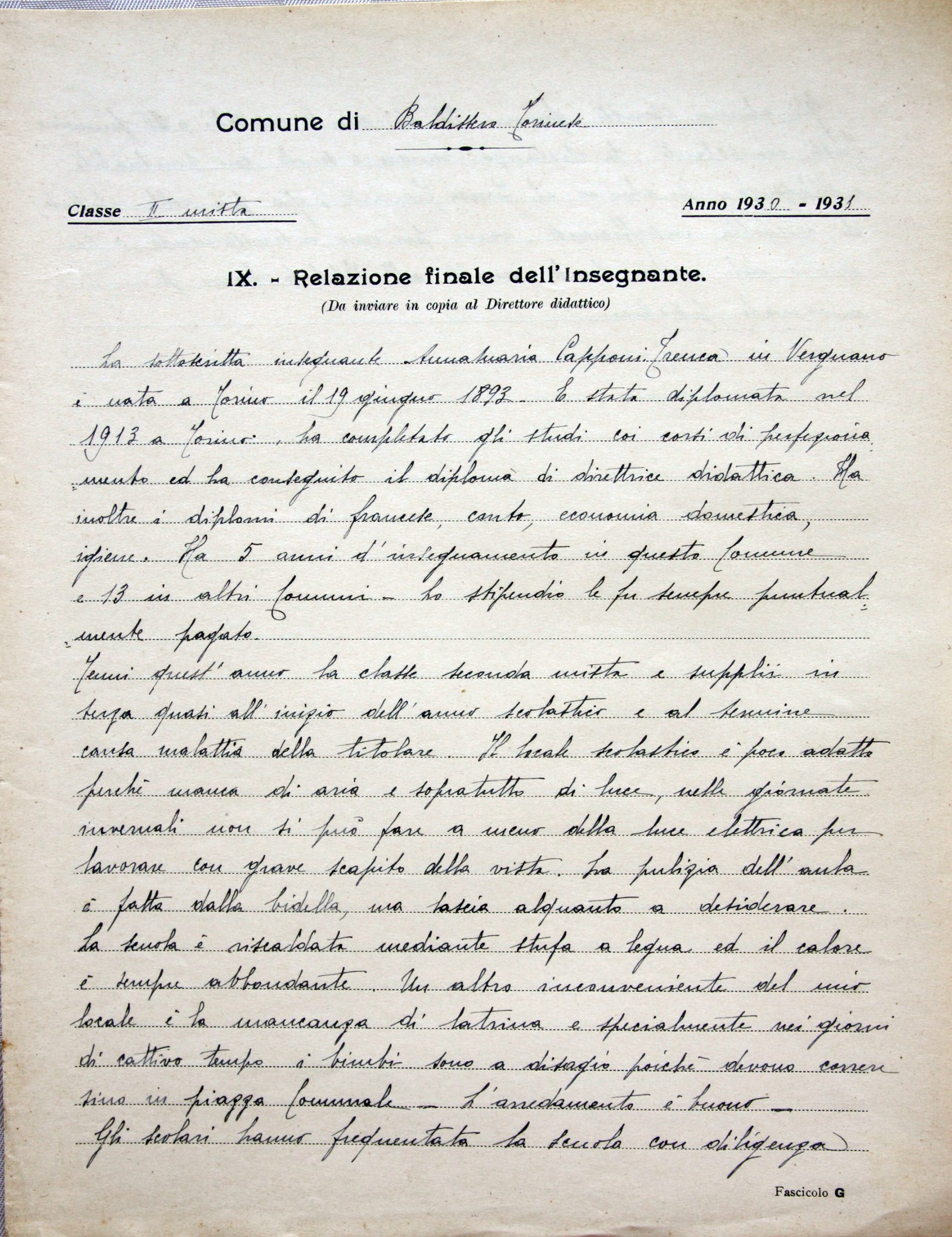 Nel diario della maestra dell’anno scolastico 1930-31, per esempio, si legge che la sua classe è una seconda mista, 25 ragazzi in tutto di cui 10 maschi; l’aula è buia e poco aerata; il riscaldamento è costituito dalla stufa a legna, che è abbondante; la pulizia è a cura della bidella, ma scarsa; soprattutto la maestra lamenta la mancanza di latrina per cui i bambini, nel caso, devono recarsi nella piazza del comune dove ce n’è una ed è disagevole, specialmente quando c’è brutto tempo.