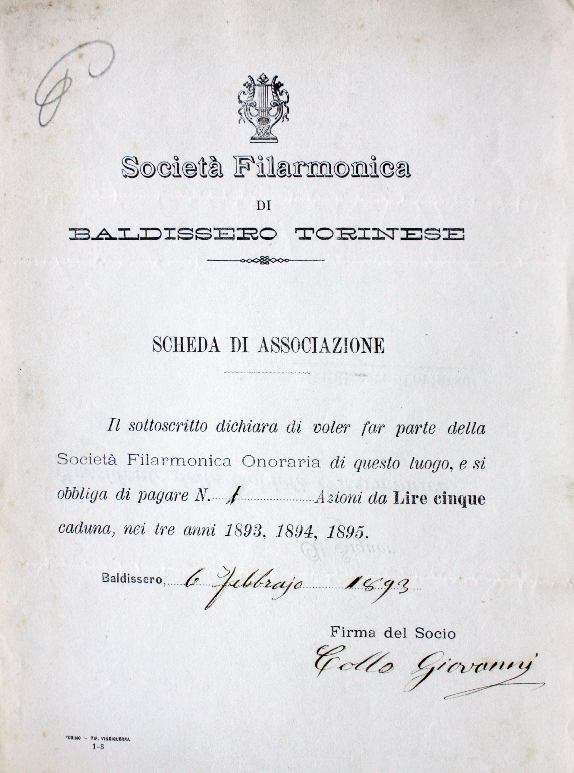 Nel 1887 nasce a Baldissero La Società Filarmonica “con lo scopo di studio e esecuzione della buona musica formando un corpo da banda e canto”. Si compone di soci azionisti e soci filarmonici.